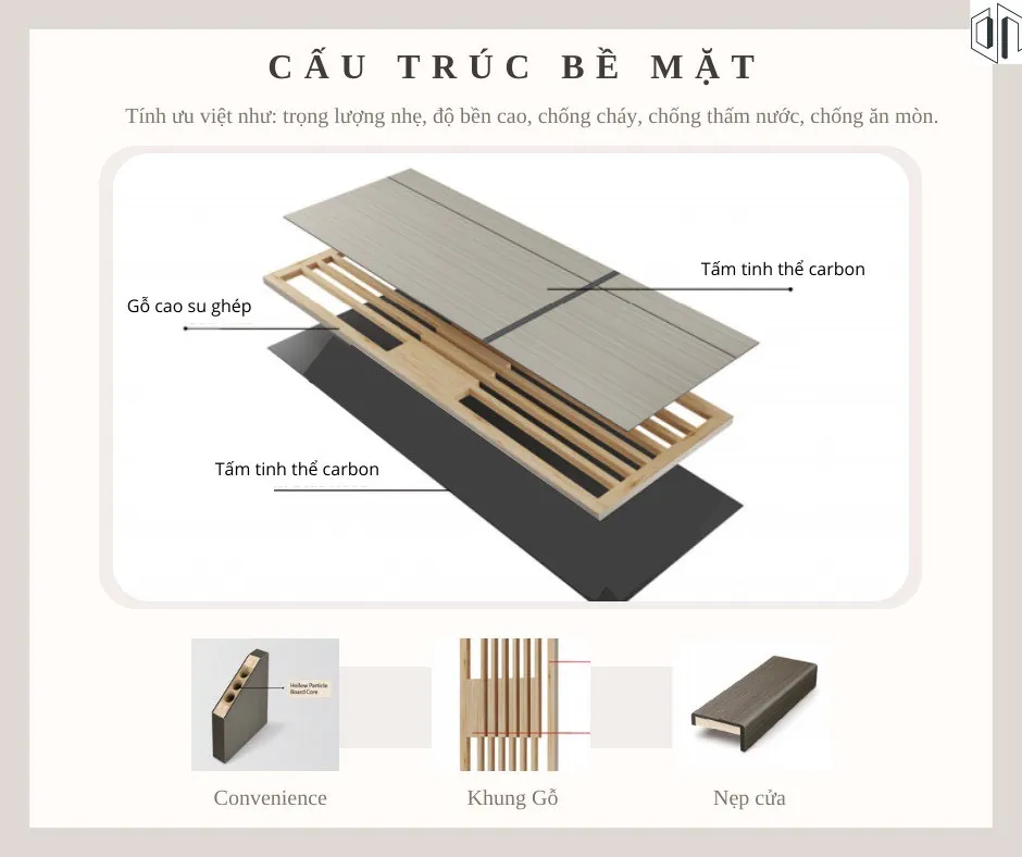 – Bề mặt: Phủ 2 tấm nhựa carbon vân gỗ, tạo nên vẻ đẹp sang trọng và hiện đại.
