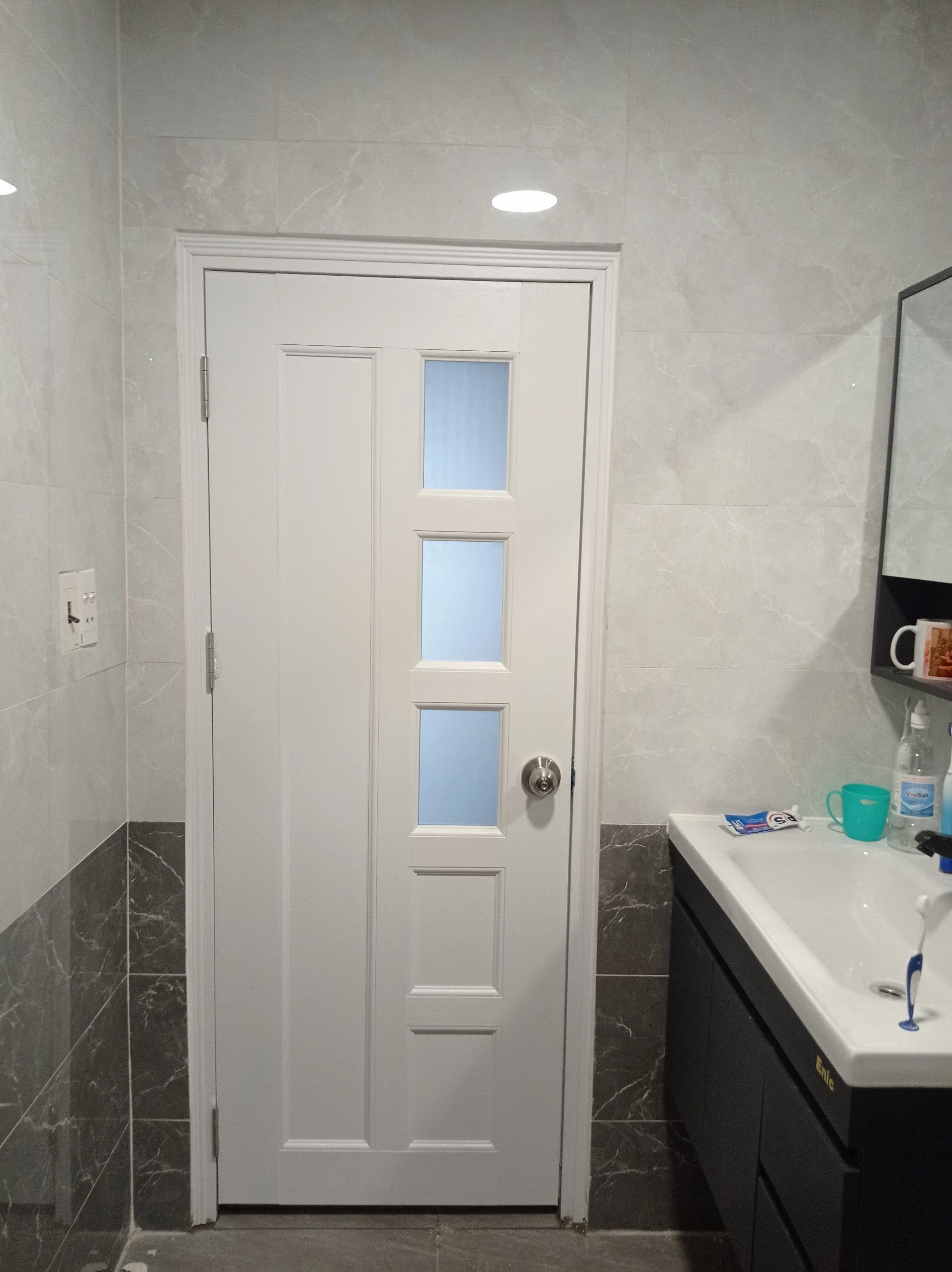 – Lớp ngoài cùng cánh cửa được phủ lên một lớp da giả gỗ với công nghệ dán hiện đại, lớp da đó cũng làm từ nhựa chống thấm nước. Sau đó đem cắt thành một cánh cửa theo kích thước chuẩn.