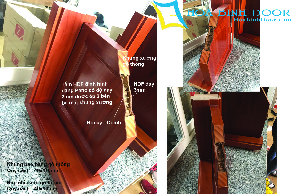 - Là 2 tấm HDF được định hình theo Panel cửa. Giữa 2 tấm HDF và khung xương là một chất liệu Honeycomb ( Giấy tổ ong ) giúp cho cánh cửa luôn chắc chắn, không bị cong vênh và co rút.